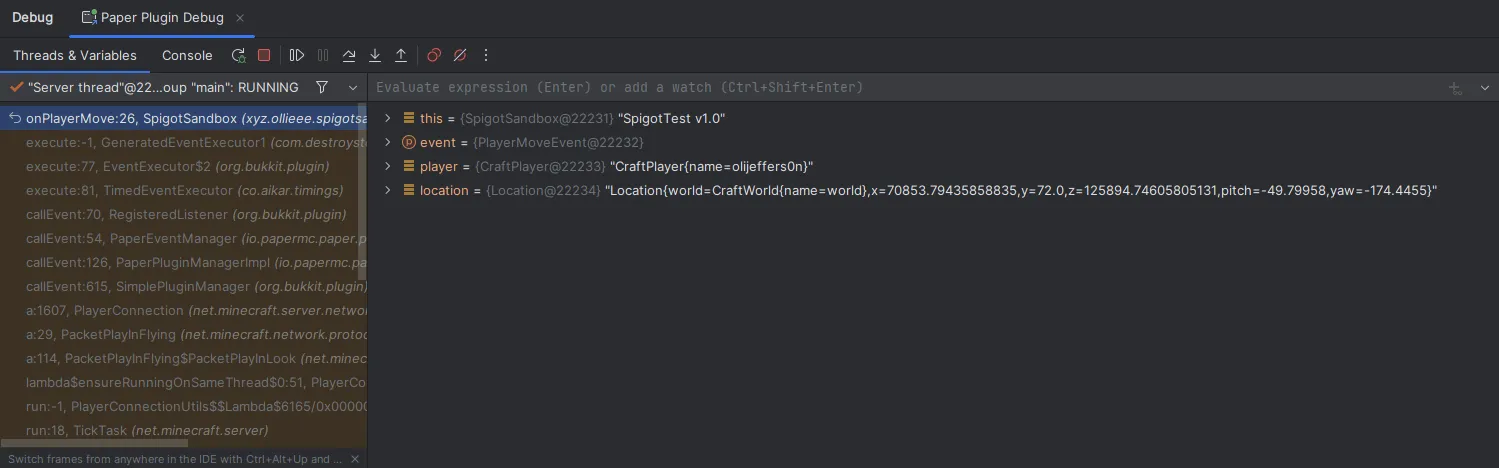 Direct debugging will allow you to run the server directly from your IDE, and will allow you to use breakpoints and step through your code. We can achieve this by using JPenilla’s Gradle plugin to run the server directly from the IDE. See here for instructions on how to set up the plugin.